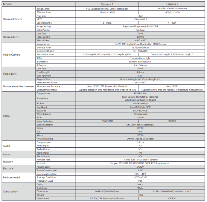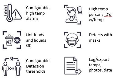 Faces are detected, foreheads scanned for temperature to within +/- 0.3 degrees C, and those with elevated temperatures are identified with color-coded alarm status and reported along with optional snapshots.