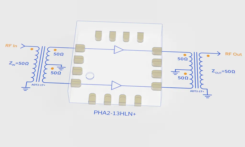The traditional configuration of a push-pull amplifier stage is shown in Figure 1. It is comprised of an amplifier stage, in this case the PHA2-13HLN+ dual matched pair, and an input and output balun transformer. The input and output transformers are impedance-matched to 50Ω to meet the amplifier requirements. The input transformer steps up from 50 to 100Ω (1:2 impedance ratio and 1:1.41 turns ratio) and is then center-tapped, while the output transformer steps down from a center-tapped 100Ω to 50Ω (2:1 impedance ratio and 1.41:1 turns ratio). Each transformer leg presents the appropriate 50Ω impedance to maintain proper matching throughout the signal path.