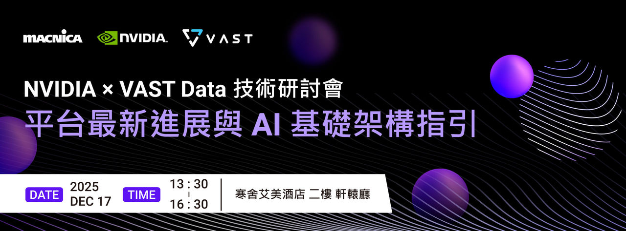 NVIDIA × VAST Data 技術研討會 — 平台最新進展與 AI 基礎架構指引 本次研討會將由 NVIDIA 與 VAST Data 專家親自分享最新平台更新,內容涵蓋 Blackwell GPU 全系列技術、Networking RA 指引與更新,以及 VAST Data 於 AI 平台的最佳實踐。透過此次交流,將協助參與者掌握完整 AI 基礎架構的關鍵發展方向。Location : 台北寒舍艾美酒店 二樓 軒轅廳 Start Date : Dec. 17, 2025 End Date : Dec. 17, 2025 Event Status : Expired -