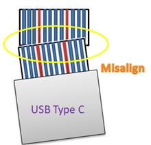 由於USB Type-C端口在8.6mm*2.6mm小型空間內容納了24 pins,導致在實際應用中很容易發生相鄰pin腳短接,其中包含電源線與高速差動訊號(TX1-, RX2-, RX1-, TX2-),一旦熱插拔過程中發生VBUS pin誤觸TX/RX pin,便可能造成TX/RX pin 之TVS防護元件損壞,如圖(一)、圖(二)。