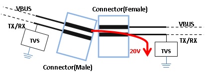 實務熱插拔過程中常見TX/RX線被誤接至VBUS的情況: